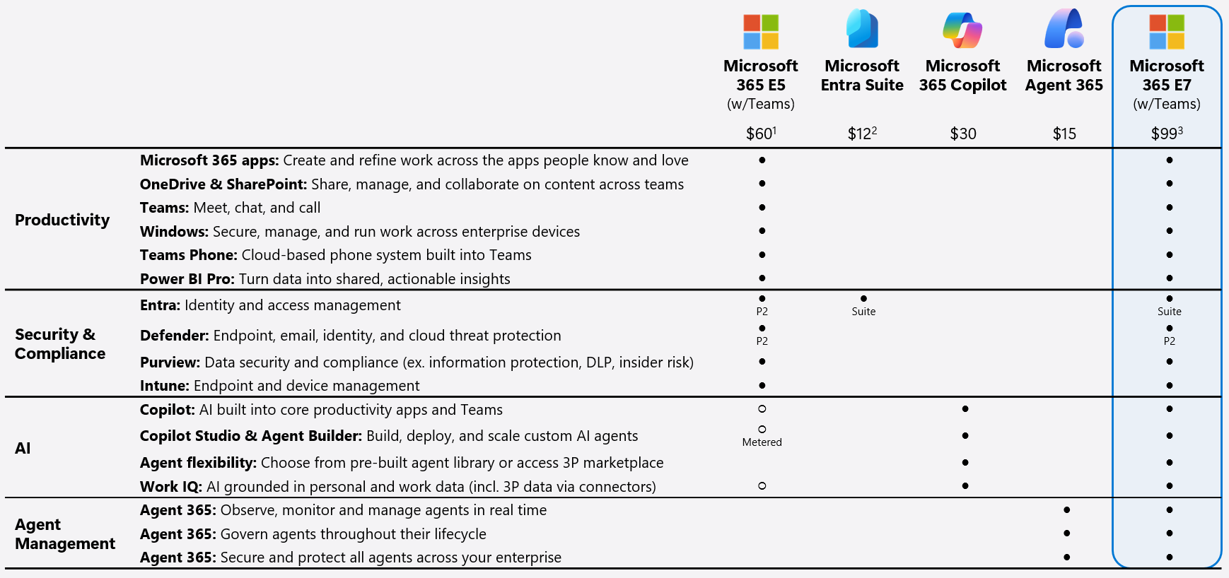 Im Kern besteht E7 aus drei Dingen: Microsoft 365 E5 als bekannte Basis für Produktivität, Sicherheit und Compliance. Microsoft 365 Copilot für AI-gestütztes Arbeiten in Word, Excel, PowerPoint, Outlook und Teams. Und Agent 365 als neue Steuerungsebene für KI-Agenten. Dazu kommen die Microsoft Entra Suite und erweiterte Funktionen aus Defender, Intune und Purview. Der Plan ist mit und ohne Teams erhältlich.